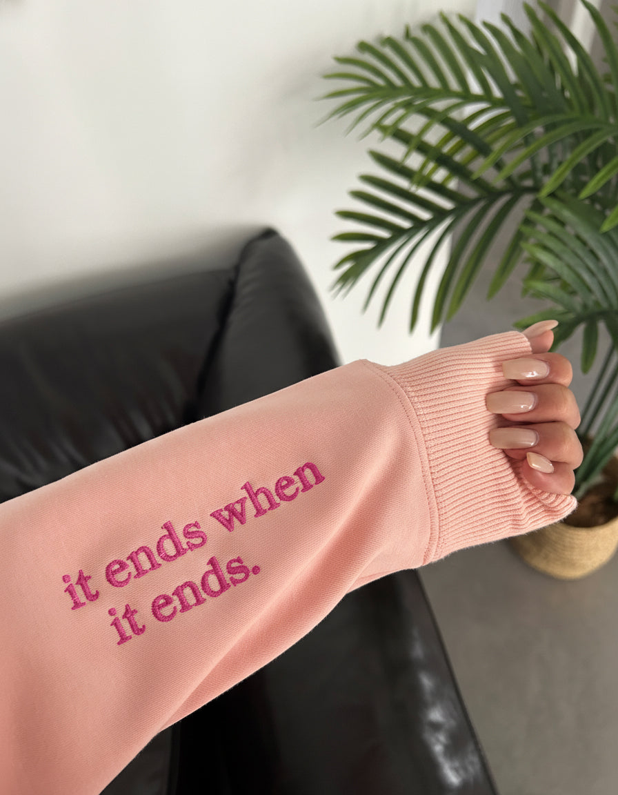 Features an embroidered quote on the chest and a delicate "it ends when it ends." detail on the inner left wrist.