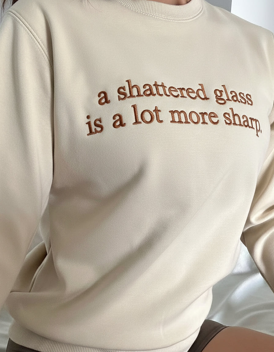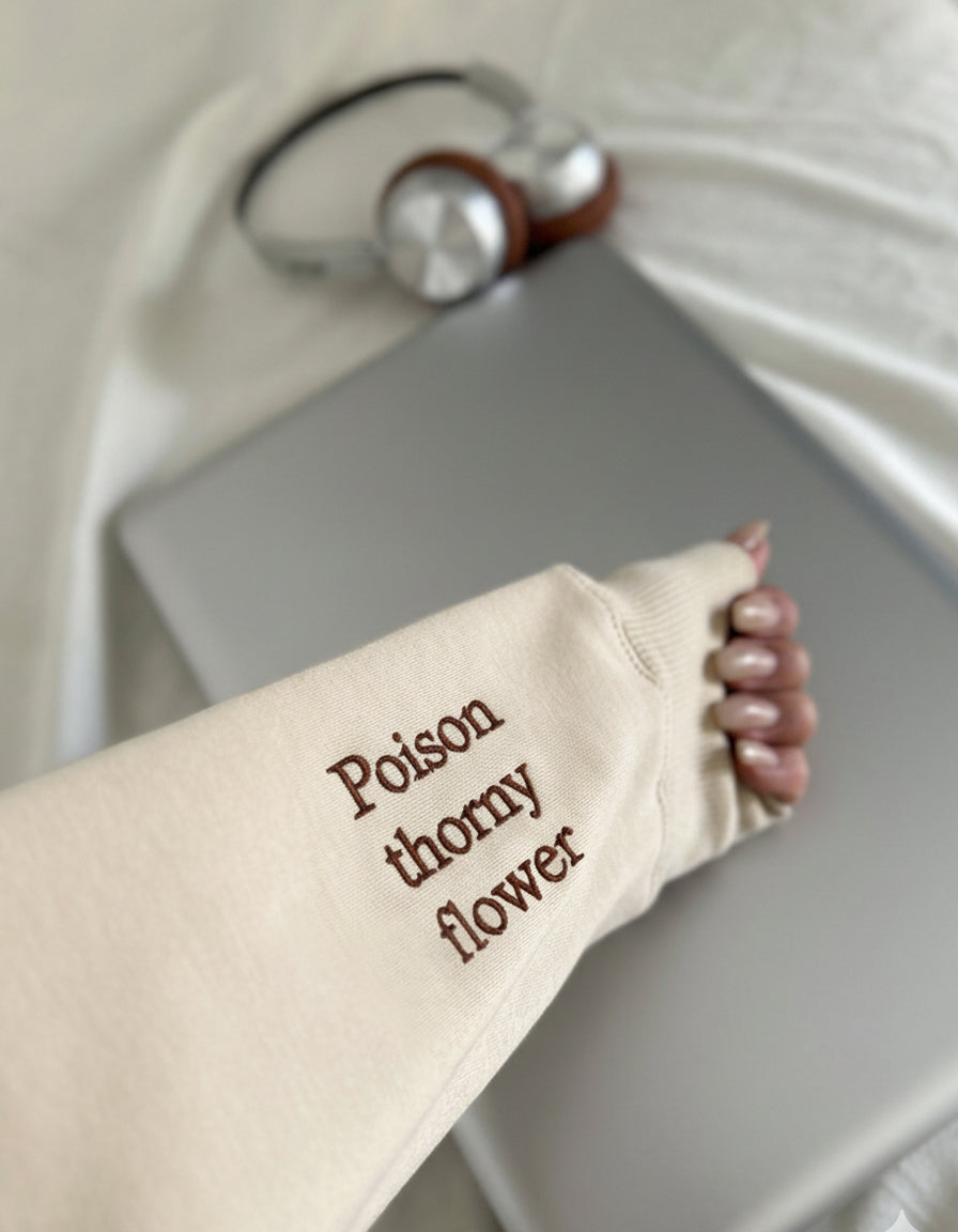 Features an embroidered quote on the chest and a delicate "Poison thorny flower" detail on the inner left wrist.